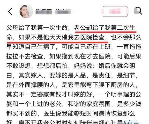 要不是老公那时这么坚持,她肯定会拖拖拉拉,直到身体疼得厉害才去检查,那后果真是没法想象啊。她在世的时候专门提过这件事,说她的父母让她第一次活过来,而她的老公则给了她第二次活的机会。她真心觉得自己找对了老公,因为她妈以前就说过,结婚最重要的是人品和责任,要看这男人在外面能不能为你顶住风头,回家能不能低下头来帮忙做家务。